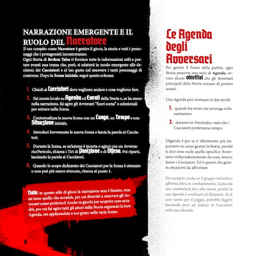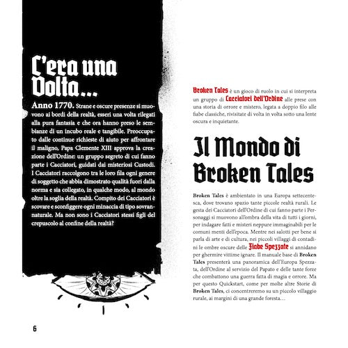 PDF, interni a colori, 24 pagine + 5 Schede + Reference e Segnalibro. Nel Quickstart troverete tutto quello che vi serve per iniziare con Broken Tales: