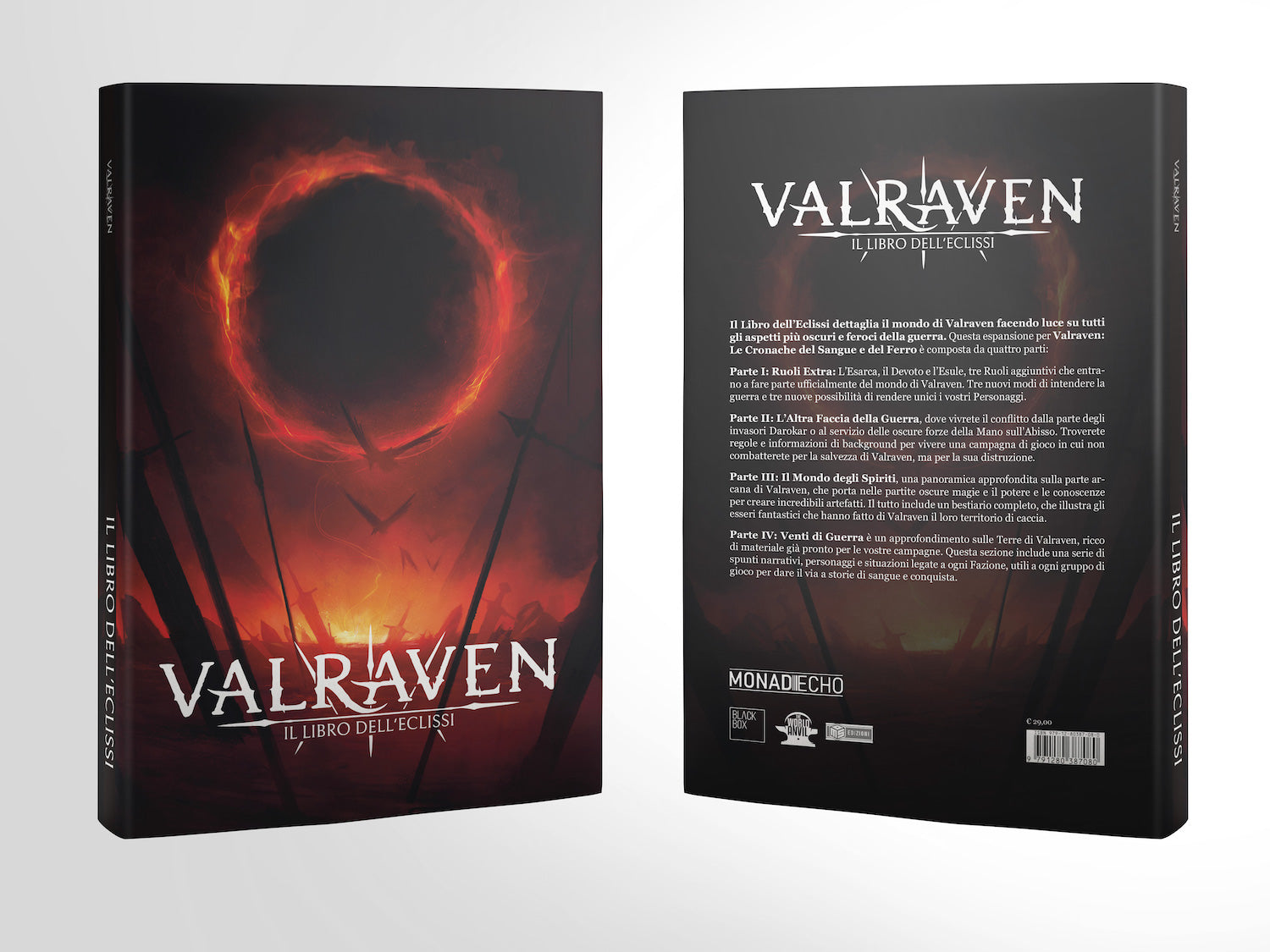 Il Libro dell’Eclissi espande il mondo di Valraven facendo luce su tutti gli aspetti più oscuri e feroci della guerra. Il manuale è diviso in quattro parti, ognuna dedicata a un diverso tipo di approccio al gioco e a caratterizzare pericoli e personalità che solcano i campi di battaglia delle terre di Valraven.